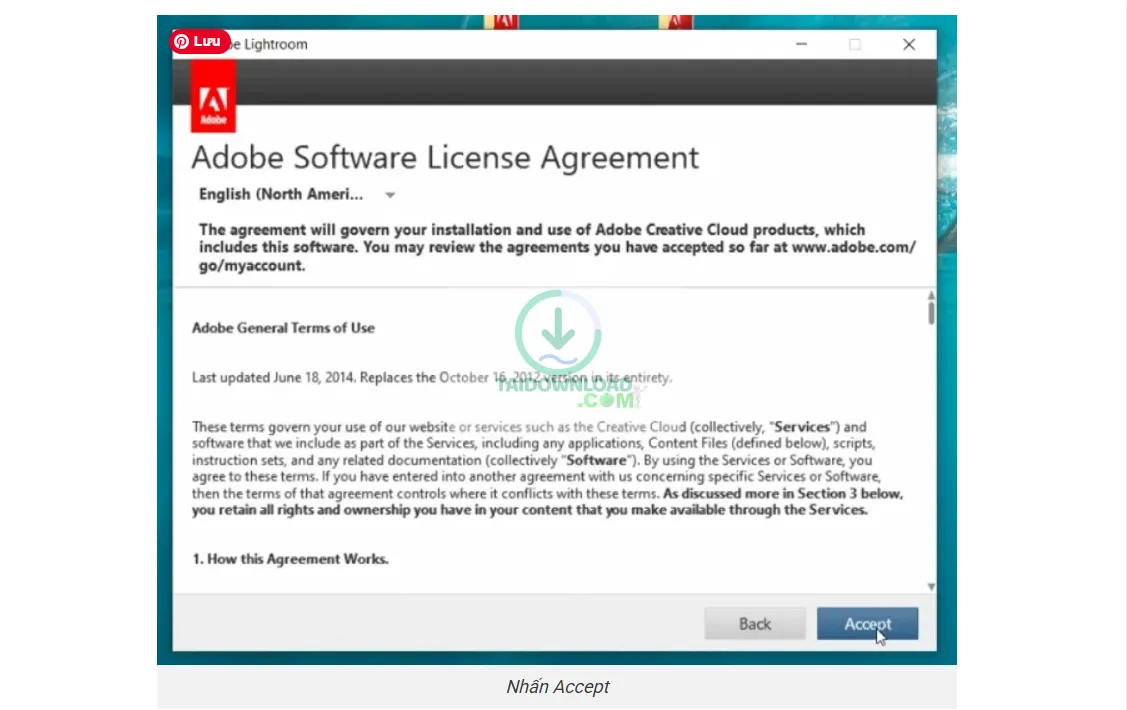 Bước 6: Sau đó hệ thống sẽ hiển thị cho bạn thông tin về điều khoản và điều lệ khi tham gia vào Adobe Lightroom. Tại đây bạn không cần quan tâm gì mà bấm vào Accept.