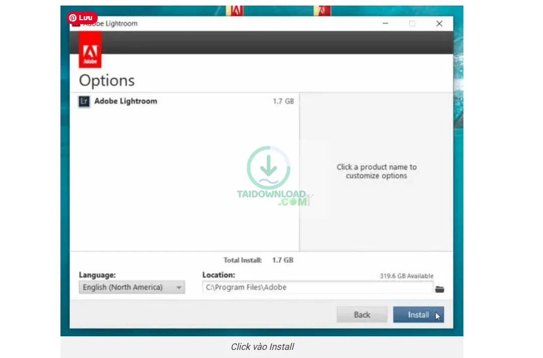 Bước 7: Cửa sổ tiếp, các bạn hãy tùy chỉnh ổ đĩa để cài đặt và lưu trữ phần mềm Lightroom CC 2017. Một khi chọn xong bạn nhấn vào Install.