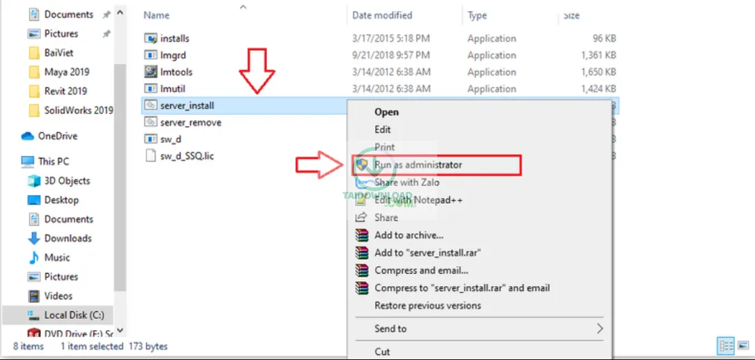 Bước 3: Copy thư mục SolidWorks_Flexnet_Server vào ổ C: và chạy file server_install.bat với quyền administrator như hình dưới: