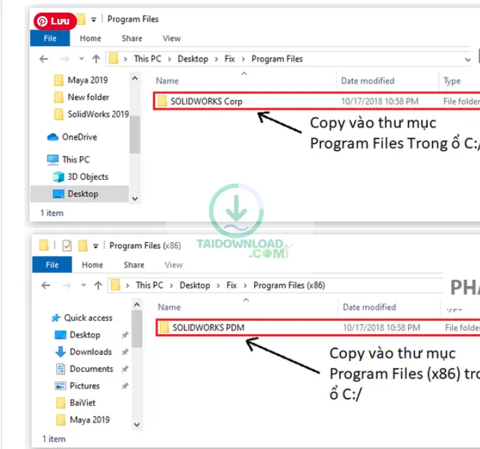 Bước 7: Copy 2 thư mục SOLIDWORKS Corp Trong Program Files và SOLIDWORKS PDM trong Program Files (x86) trong thư mục Fix vào Program Files, Program Files (x86) trong ổ C: Tùy chọn như hình dưới…